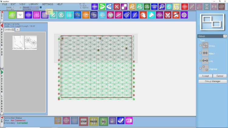 Use the Group tool to link rows within the sew zone. Ensure the group fits the sew zone.