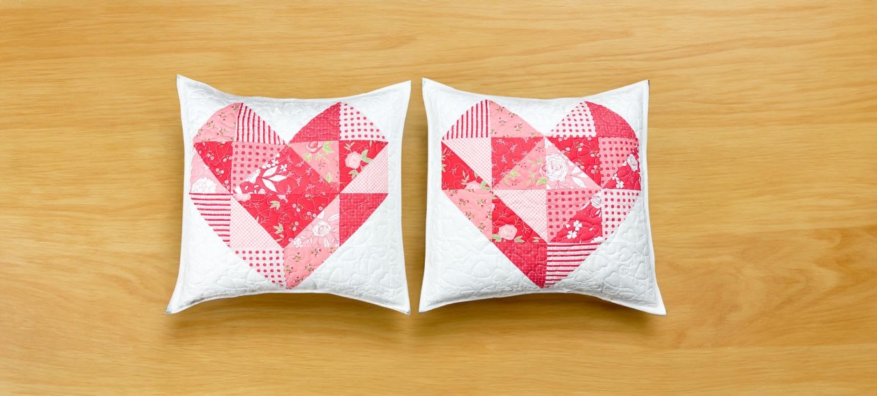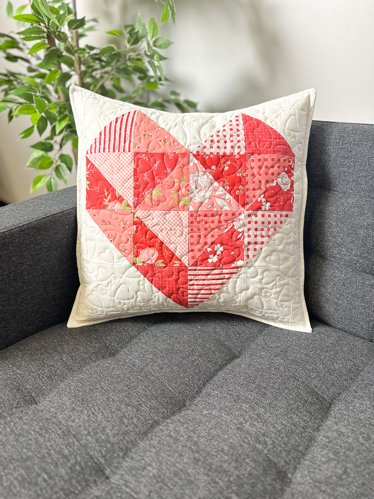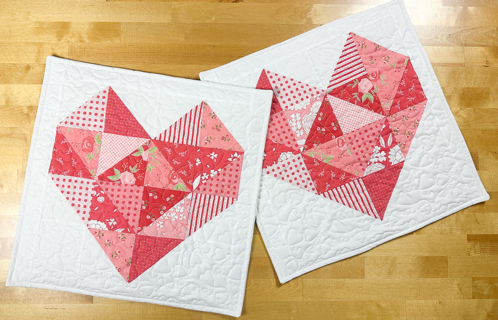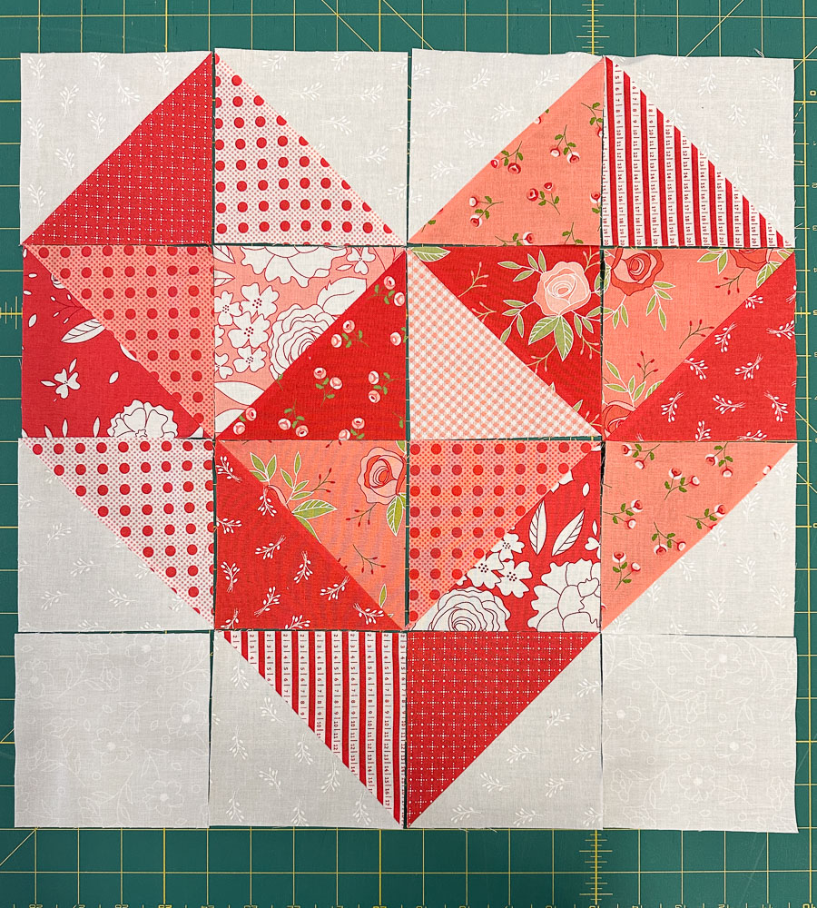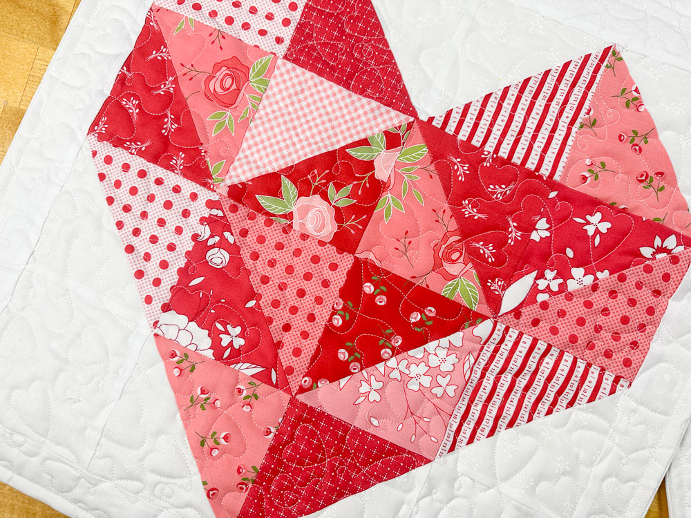 The heart block, crafted with Half Square Triangles (HST), makes this project precut, scrap and beginner-friendly!
