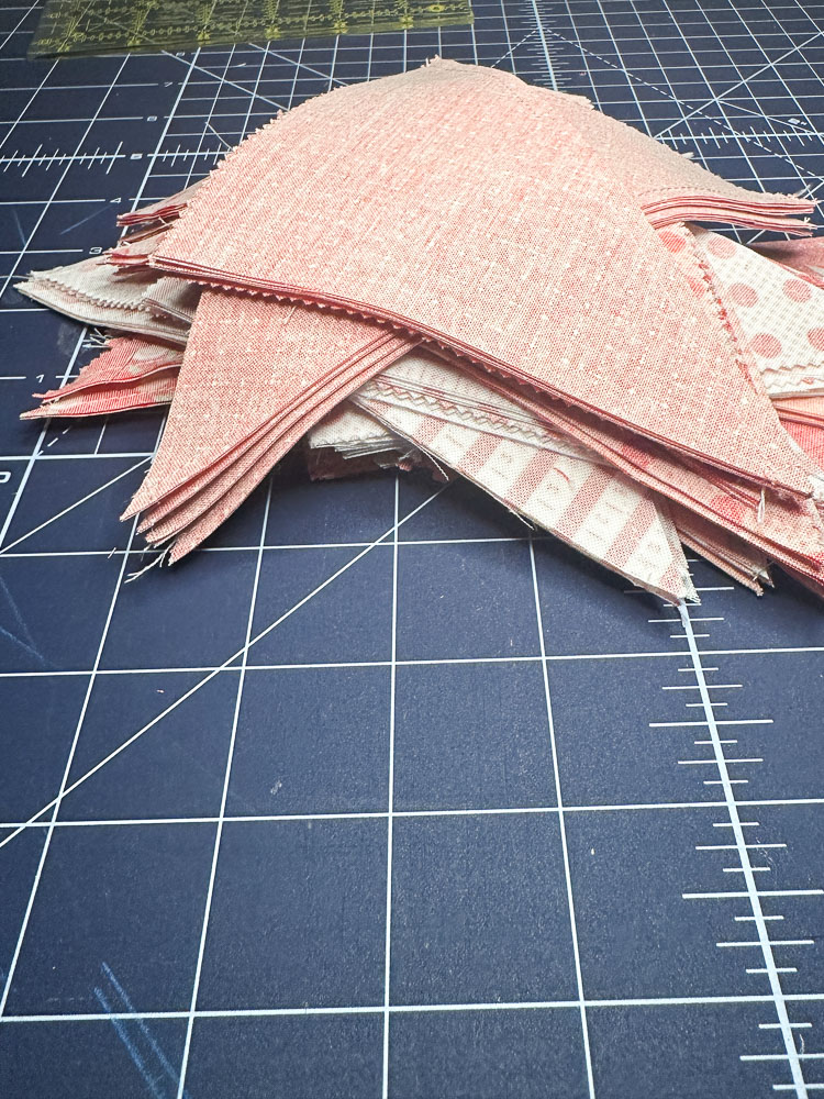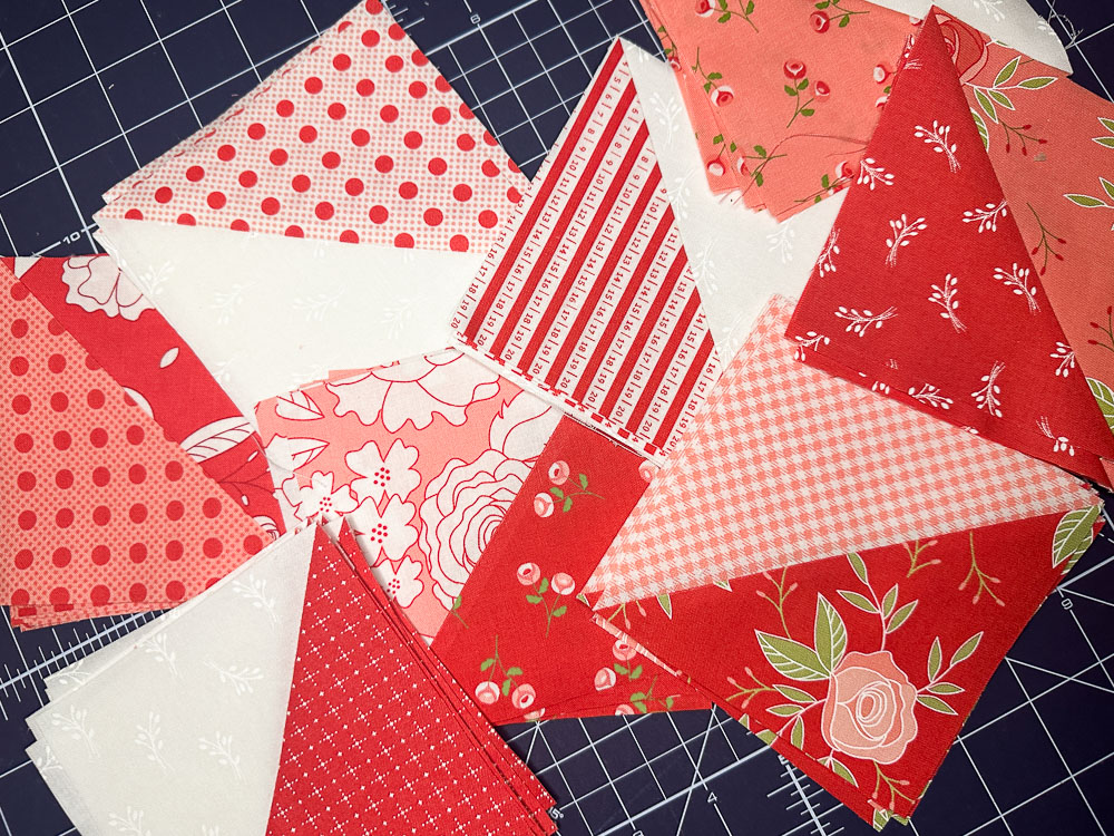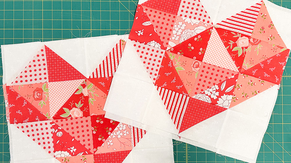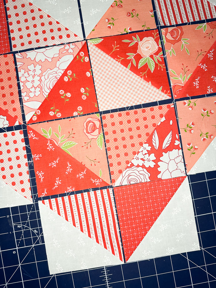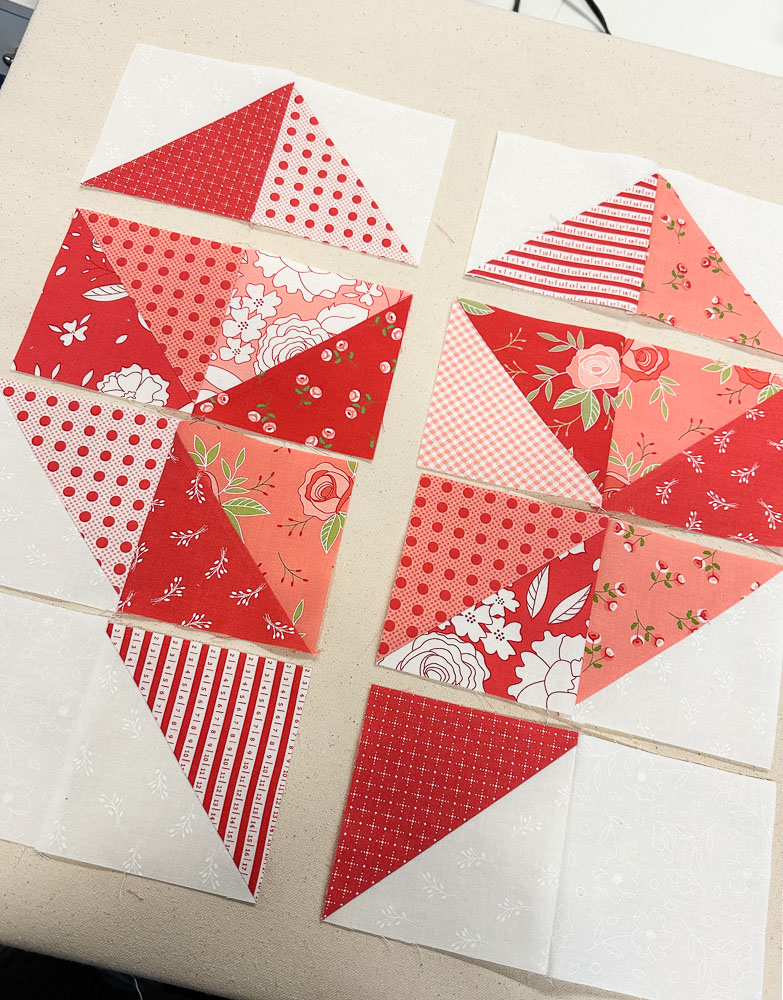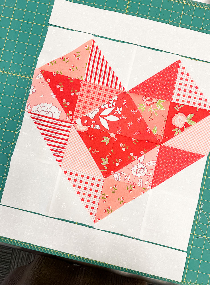 The heart block, crafted with Half Square Triangles (HST), makes this project precut, scrap and beginner-friendly!