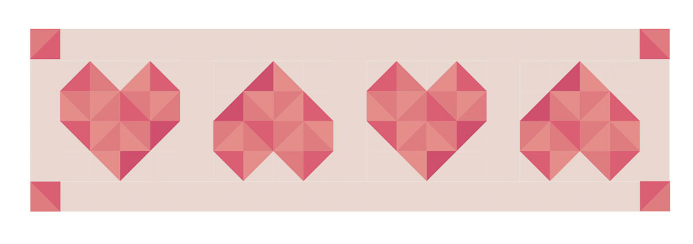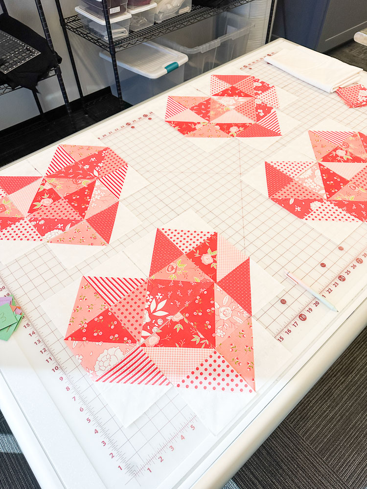 Next, arrange your 4 heart blocks using the HSTs and the (8) 4 ½" x 4 ½" background squares.