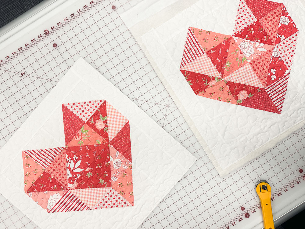 Lay one quilted heart block down right side up