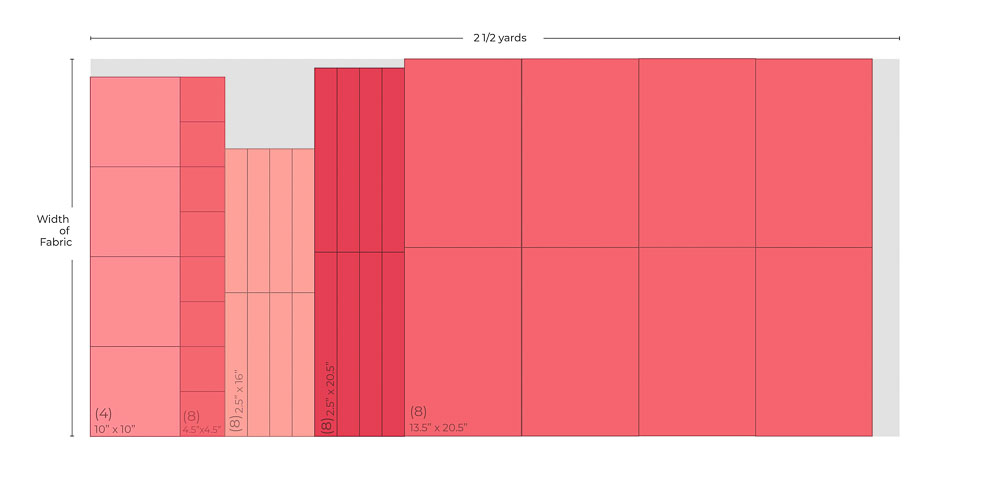| (12) 10" squares | Combination of coordinating light to dark fabrics | (4) 10" squares (8) 4 ½" squares (8) 2 ½" x 16" strips (8) 2 ½" x 20 ½ strips (8) 13 ½" x 20 ½" rectangles |